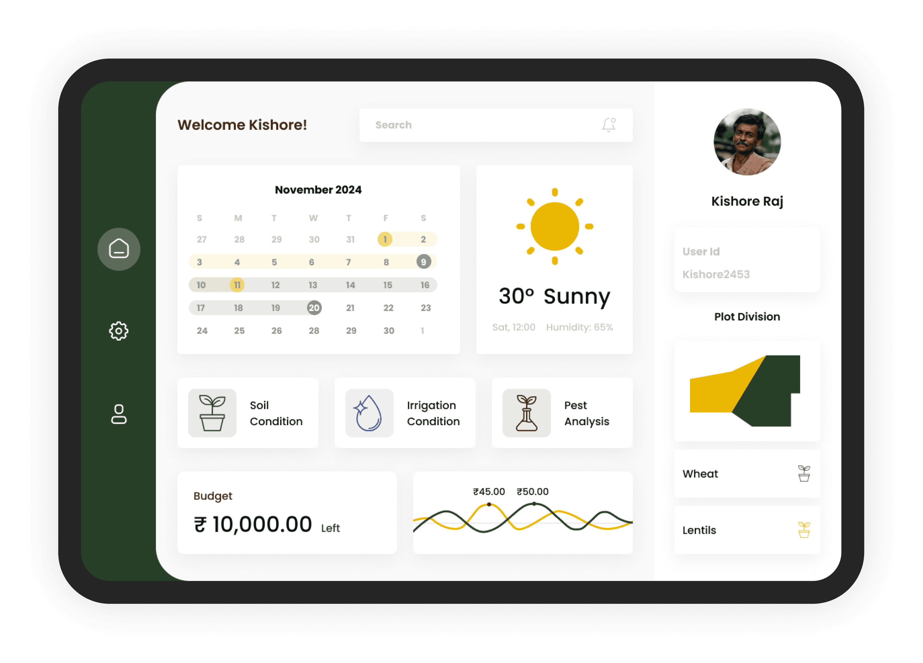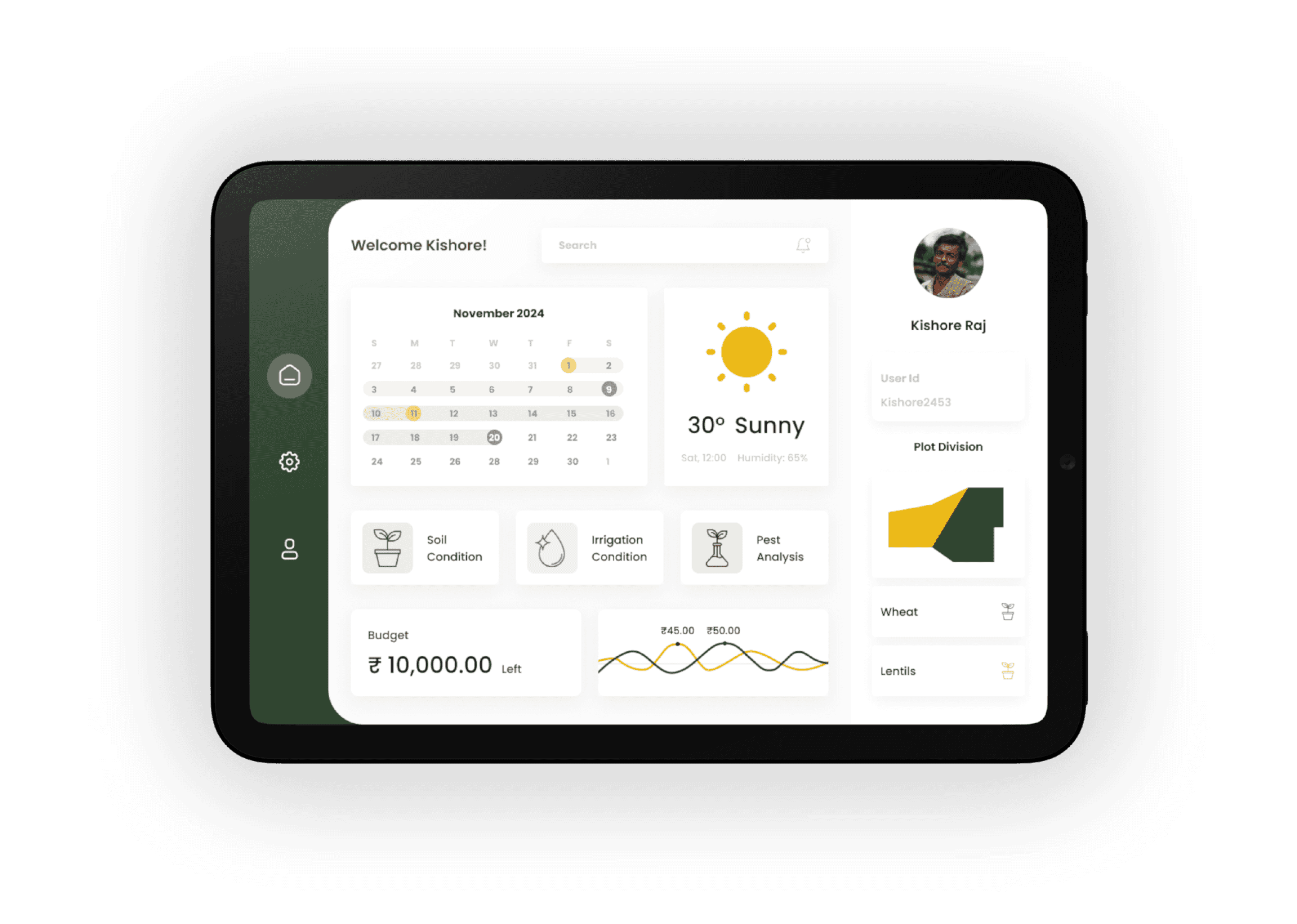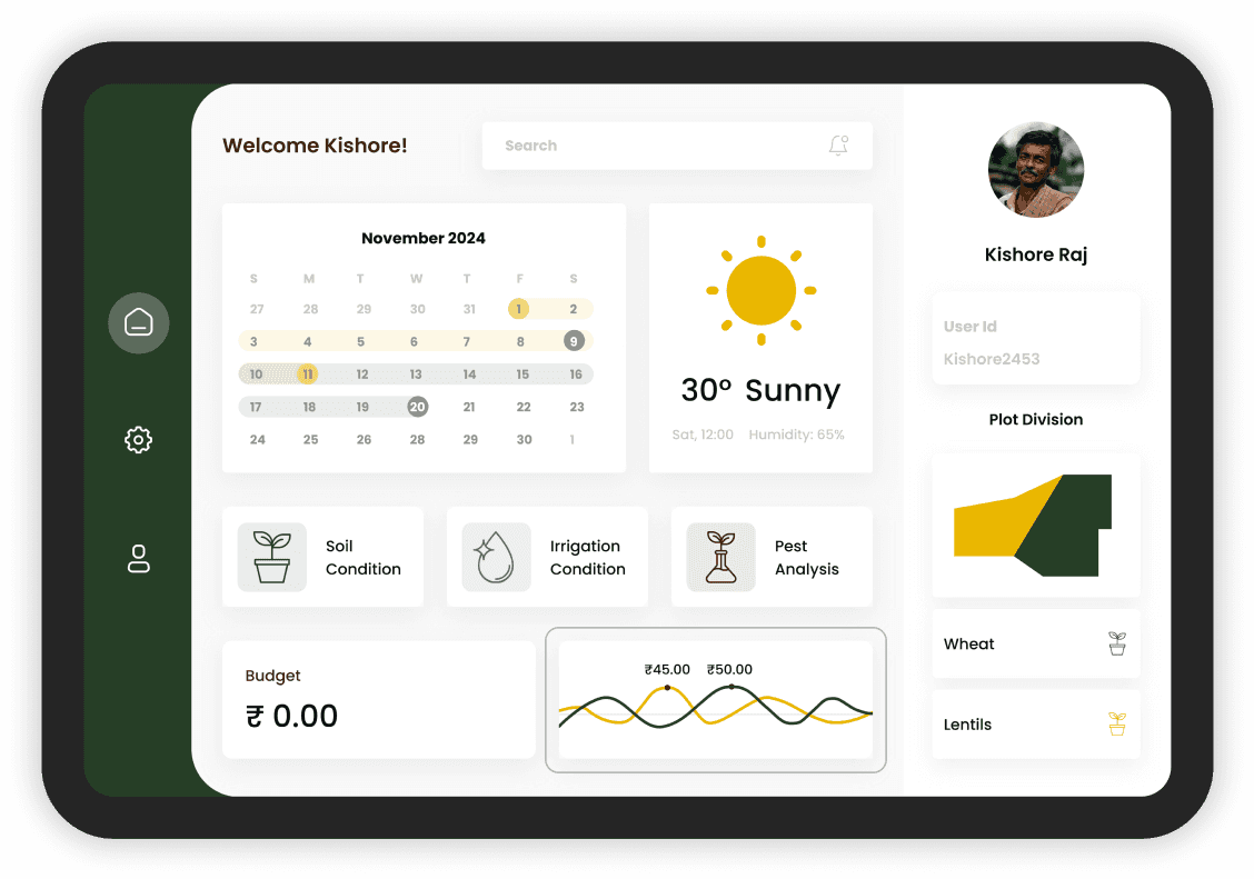 Personalised dashboard, real-time updates, and quick access to key features like plot division, crop(s) cycle, crop(s) health, weather forecasts, marker value and financial tools, ensuring seamless navigation for farmers.