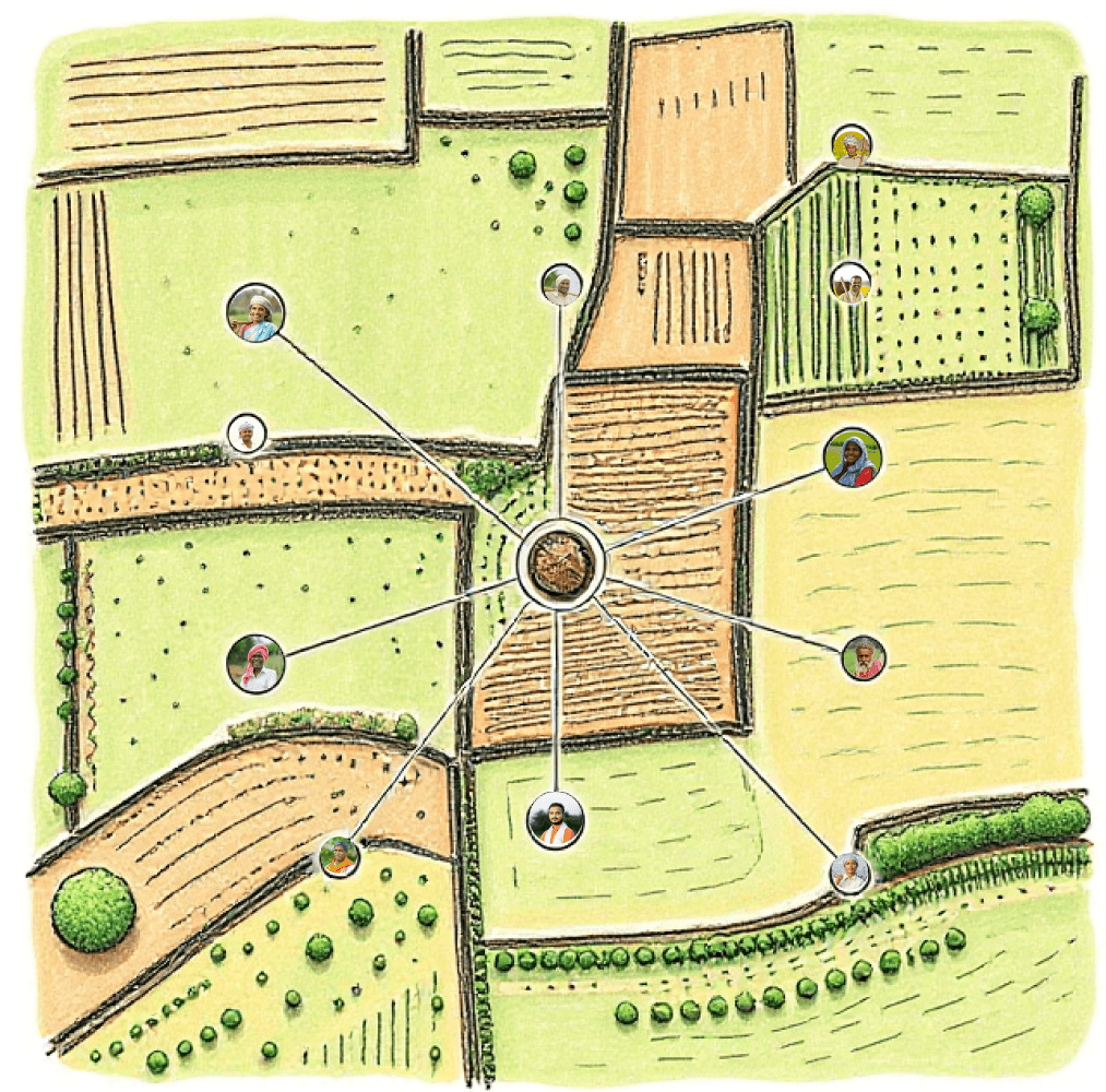 Land of different farmers would be connected to a central hub. Each plot of land would be equipped with the required sensors & equipment (IoT system) needed for the service to work.