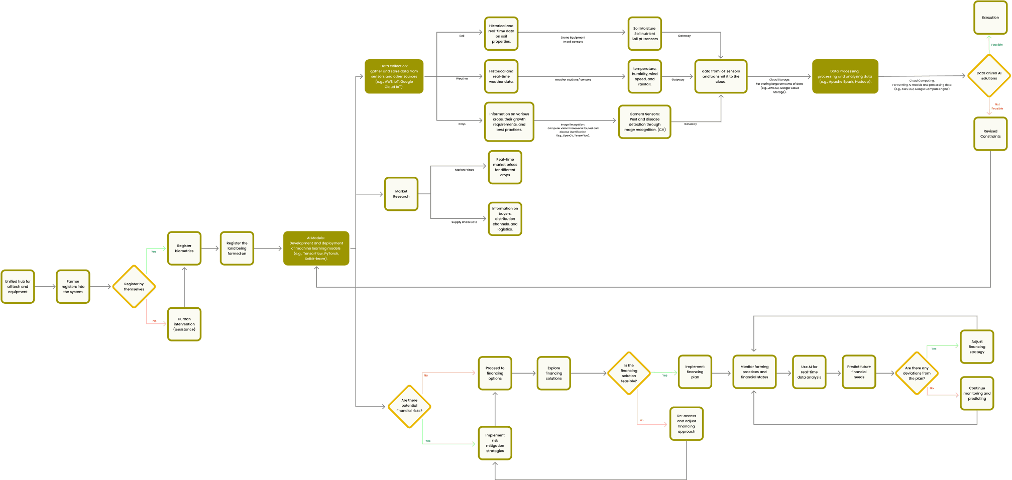 The User flow helps map out how the each aspect of Annapurna are connected and interacting with one another. An overview approach was taken when designing the flow to give a more summarized and birdseye view of the solution, detailing of the process was done in the flowchart above.