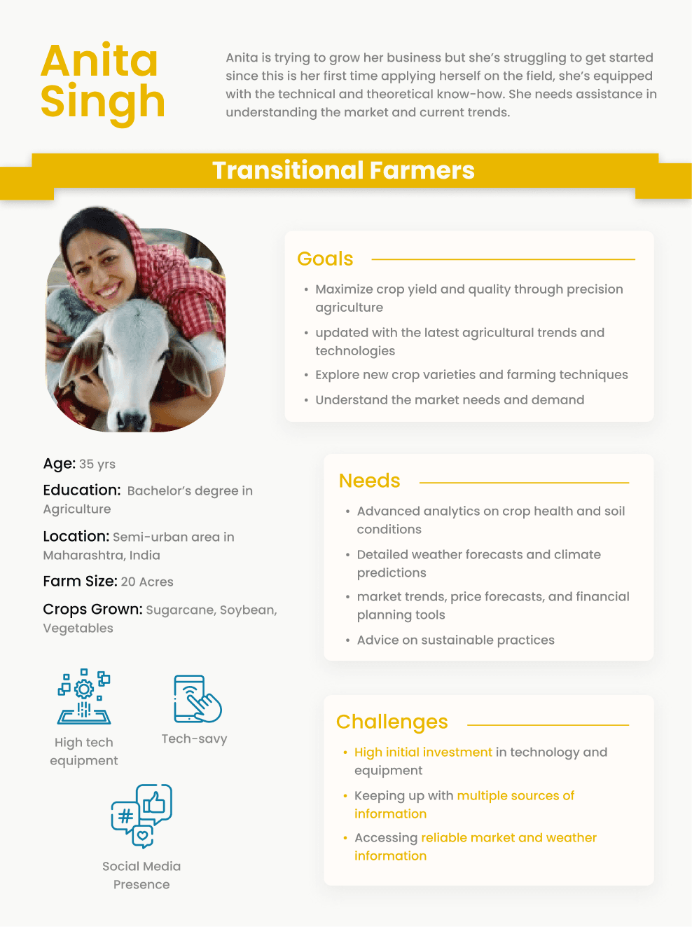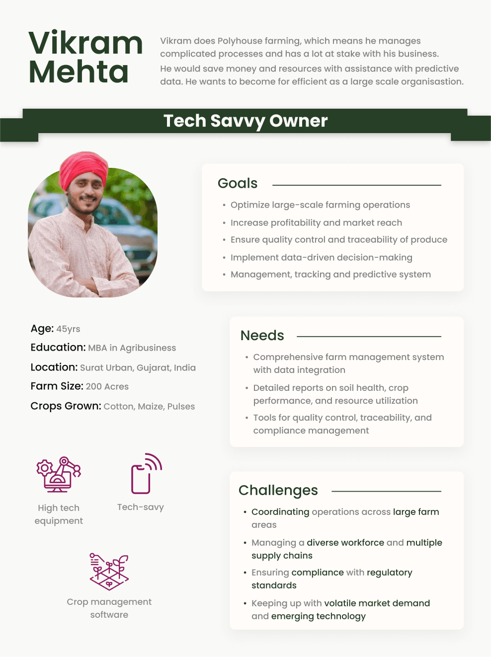 Usually younger, educated & financially better positioned to invest in technology. They are aware of market dynamics, sustainability practices, & actively seek innovative solutions for farming challenges.