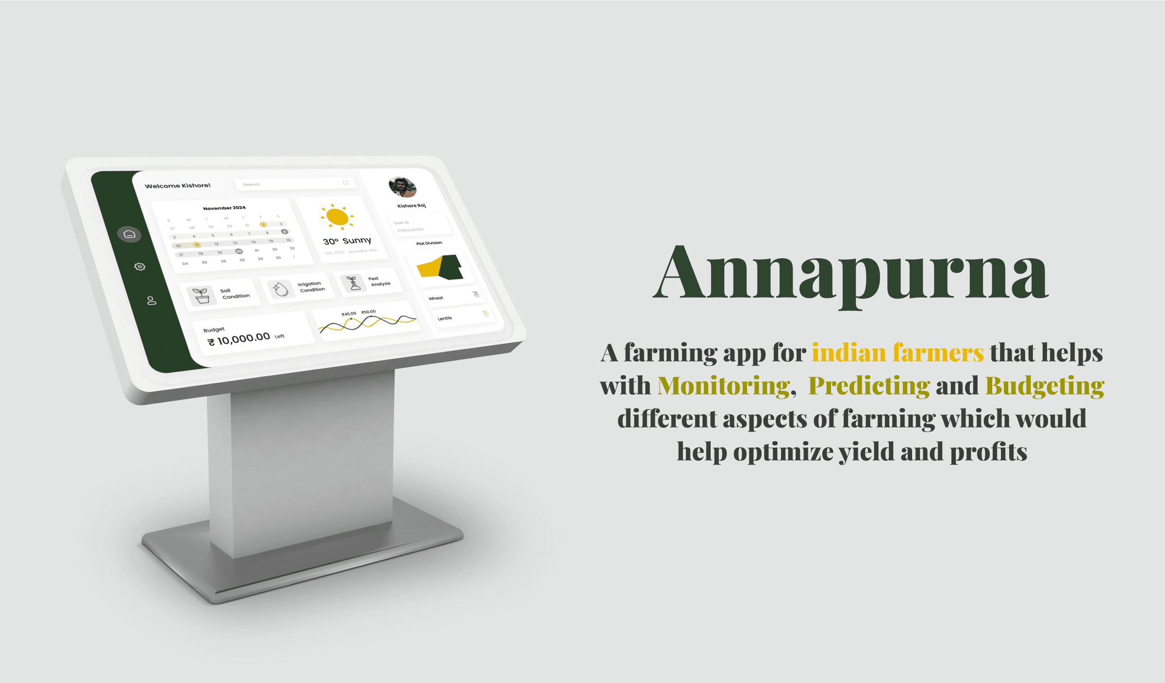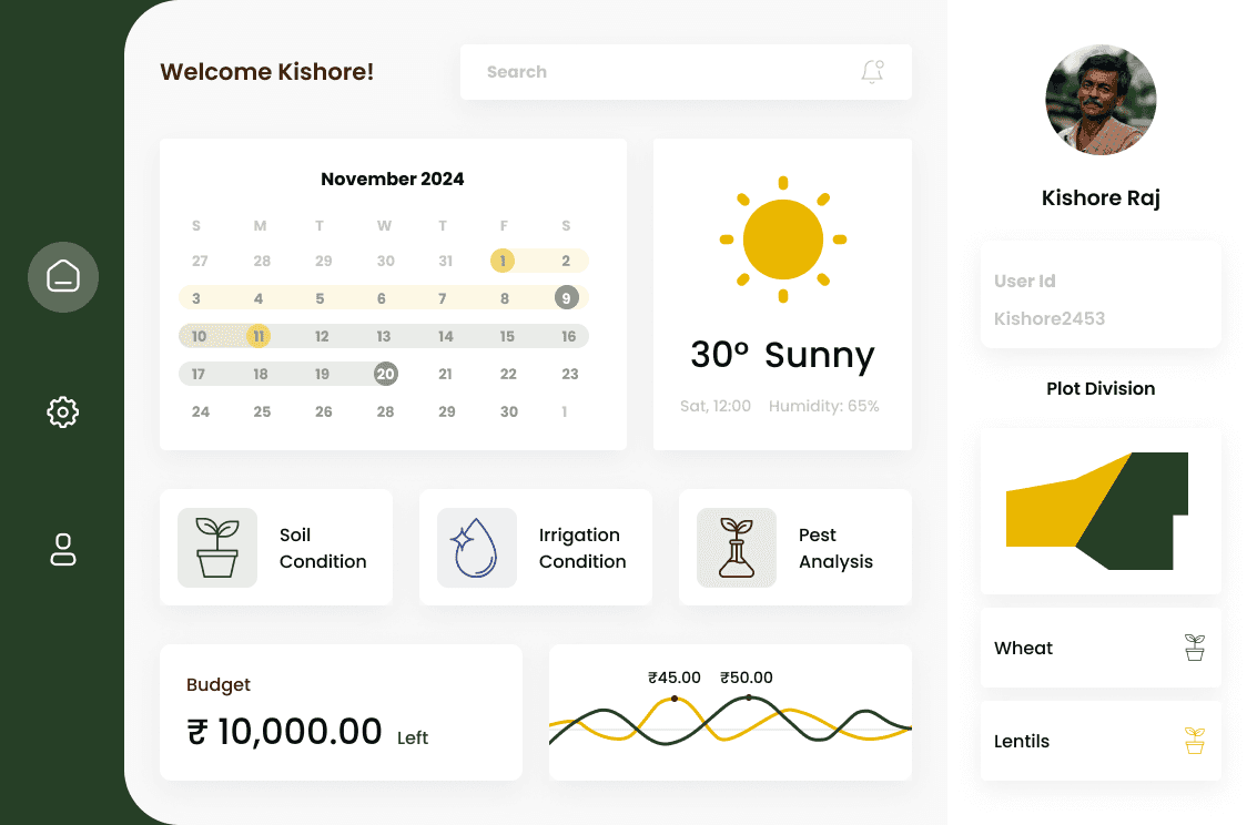 A farming app that provides real-time insights and tailored guidance on crop health, weather, and market trends. It empowers farmers to make data-driven decisions, optimising resources and maximising yield.